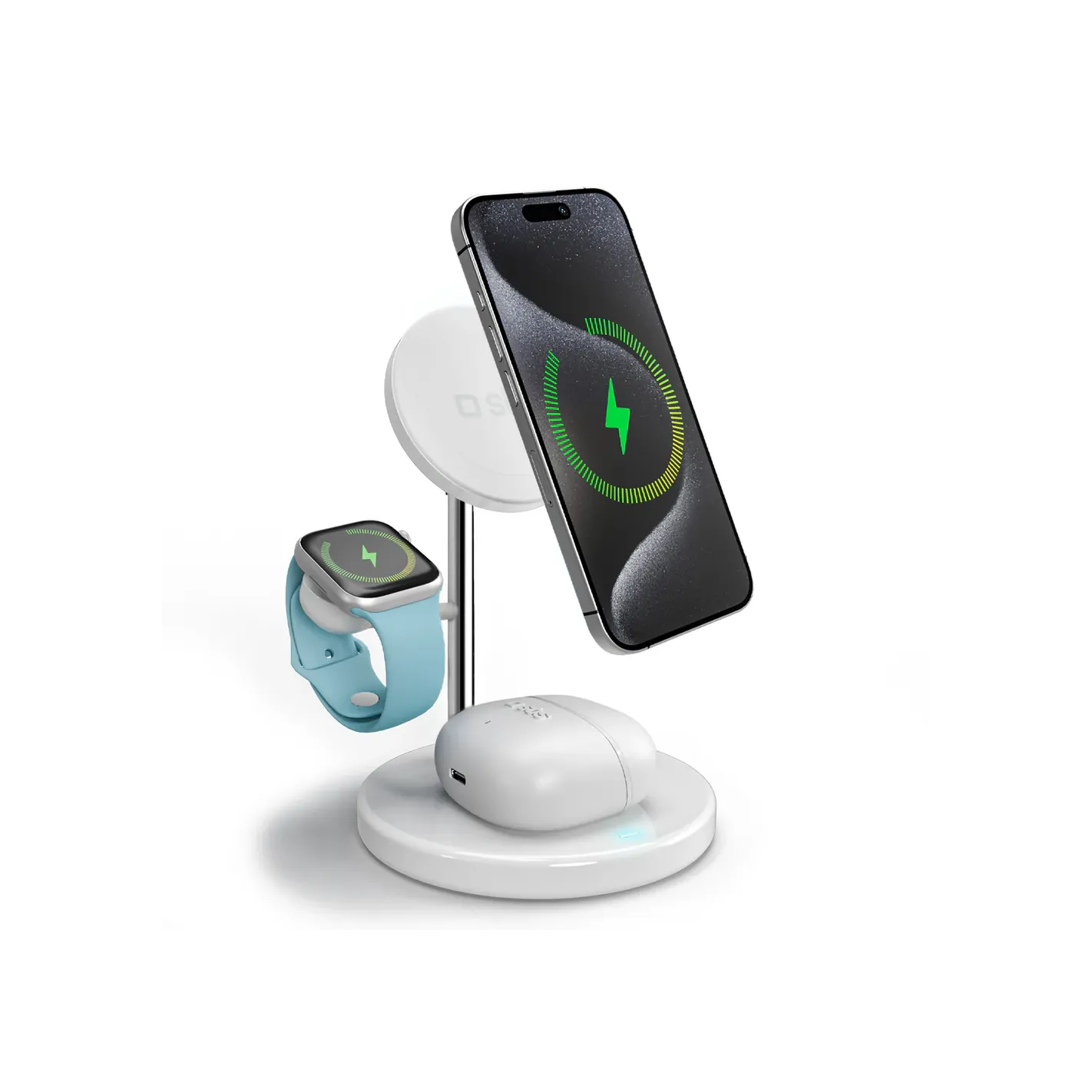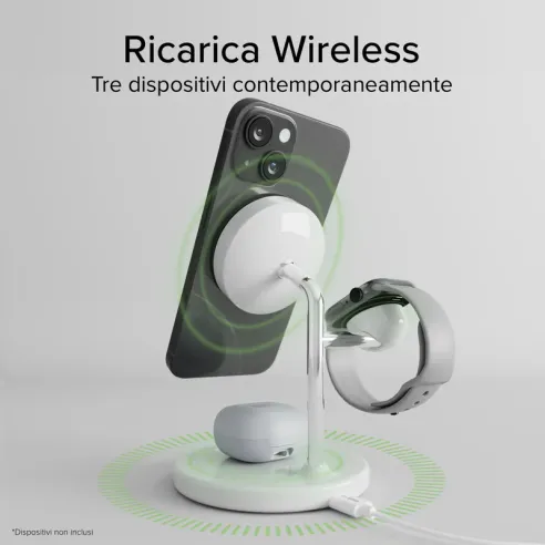 Progettata per essere universale, la nostra stazione supporta iPhone 16/15/14/13/12, smartphone Android compatibili, auricolari wireless e l'Apple Watch. La compatibilità con la tecnologia MagSafe offre un'esperienza di ricarica ancora più fluida e sicura per i dispositivi Apple.