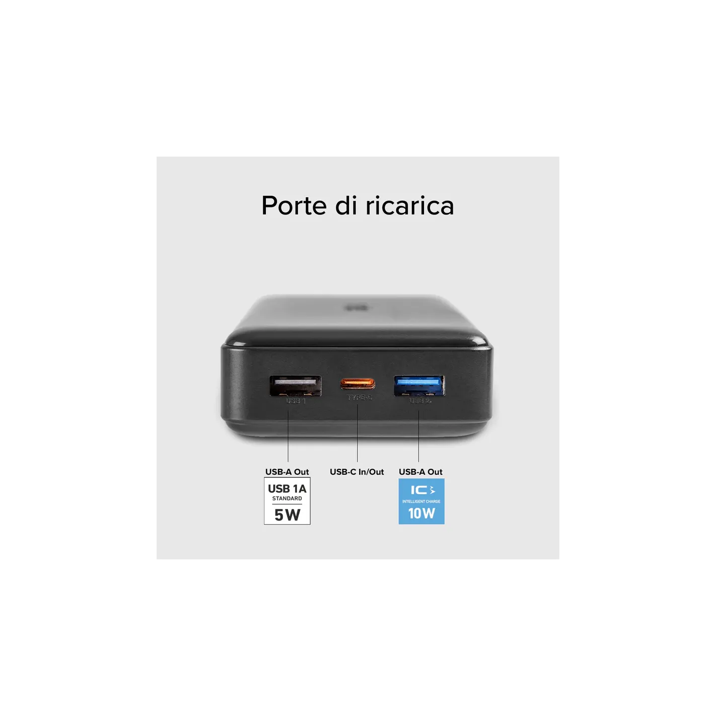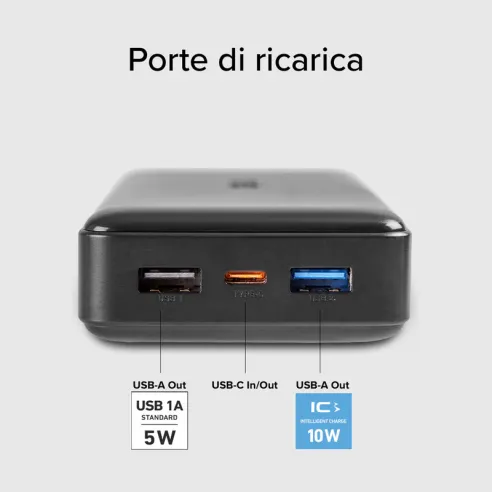 La porta USB-C a 10 Watt ricarica il power bank e i tuoi dispositivi