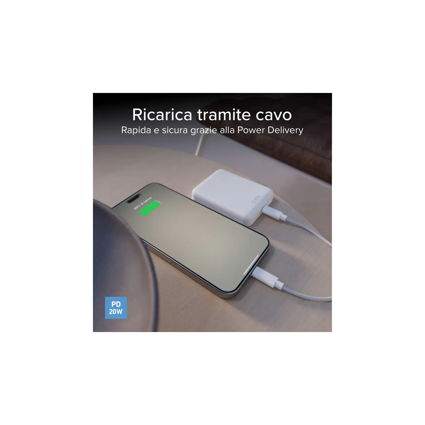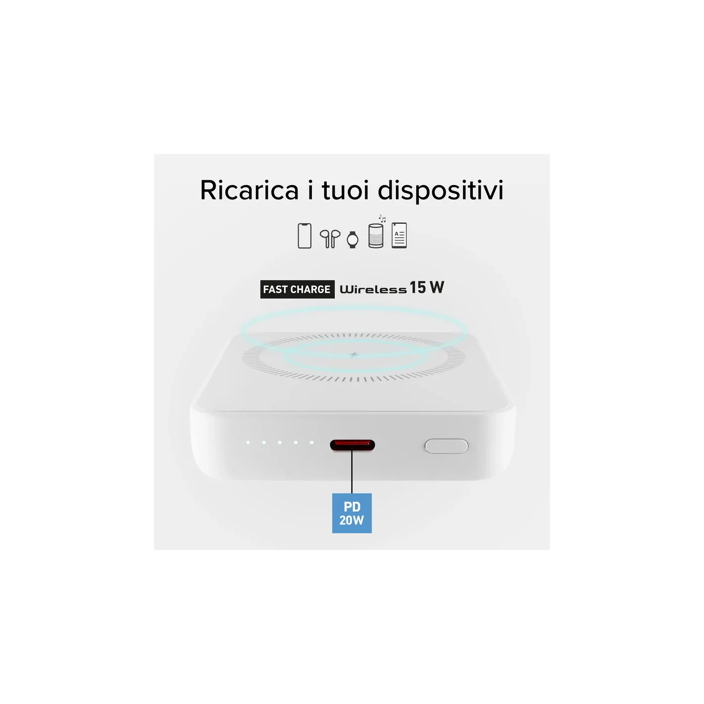 II powerbank da 5000 mAh ti permette di ricaricare il tuo telefono mentre cammini in strada, sei a lavoro o in auto e non hai una fonte di energia a portata di mano. La superficie piana consente di ricaricare uno smartphone Android abilitato all'alimentazione wireless. Appoggia il tuo dispositivo su di essa e la ricarica a 15W partirà in automatico. Grazie al magnete integrato, è perfetto per gli iPhone con ricarica MagSafe: avvicinando il tuo cellulare Apple alla base, quest'ultima si fisserà magneticamente alla scocca del telefono.