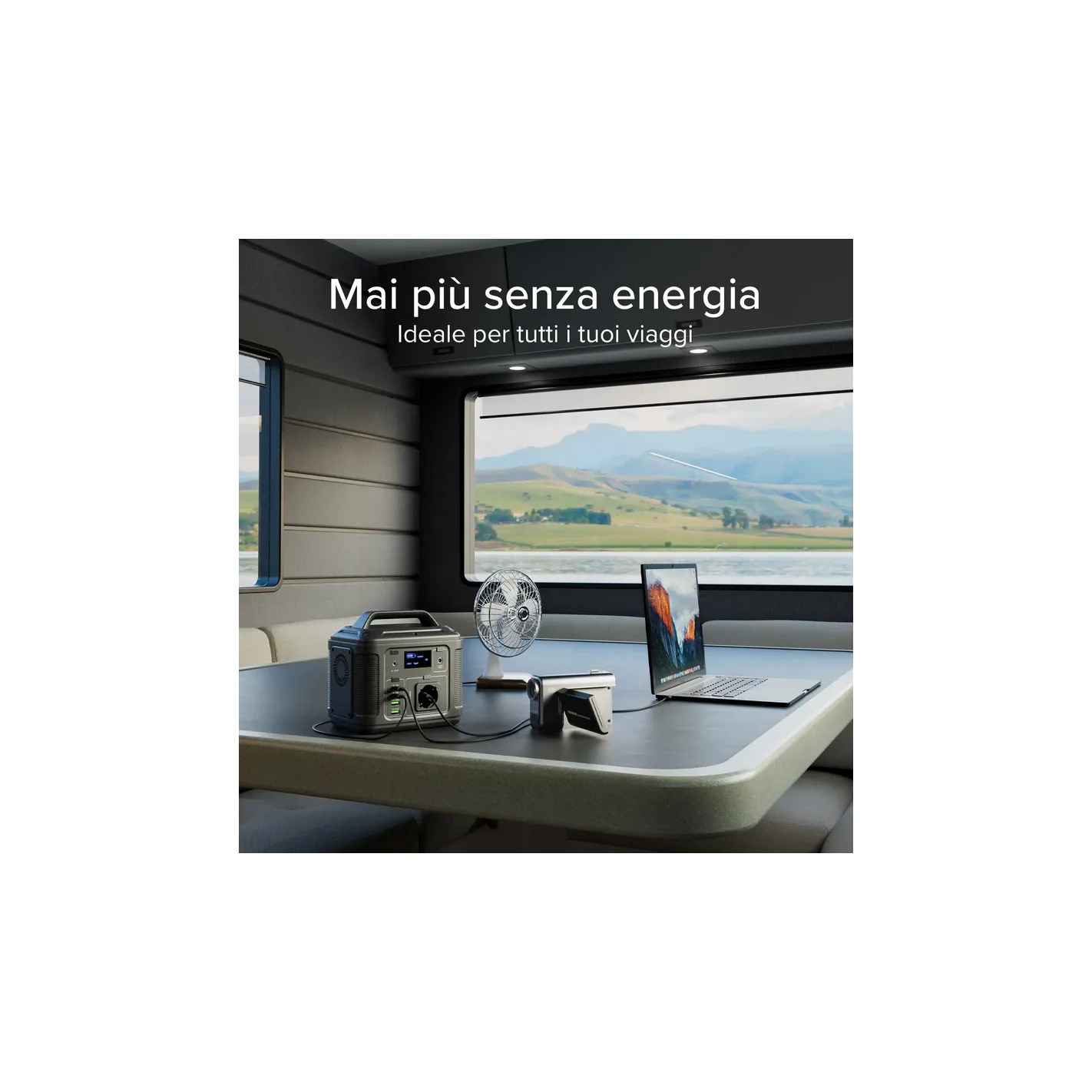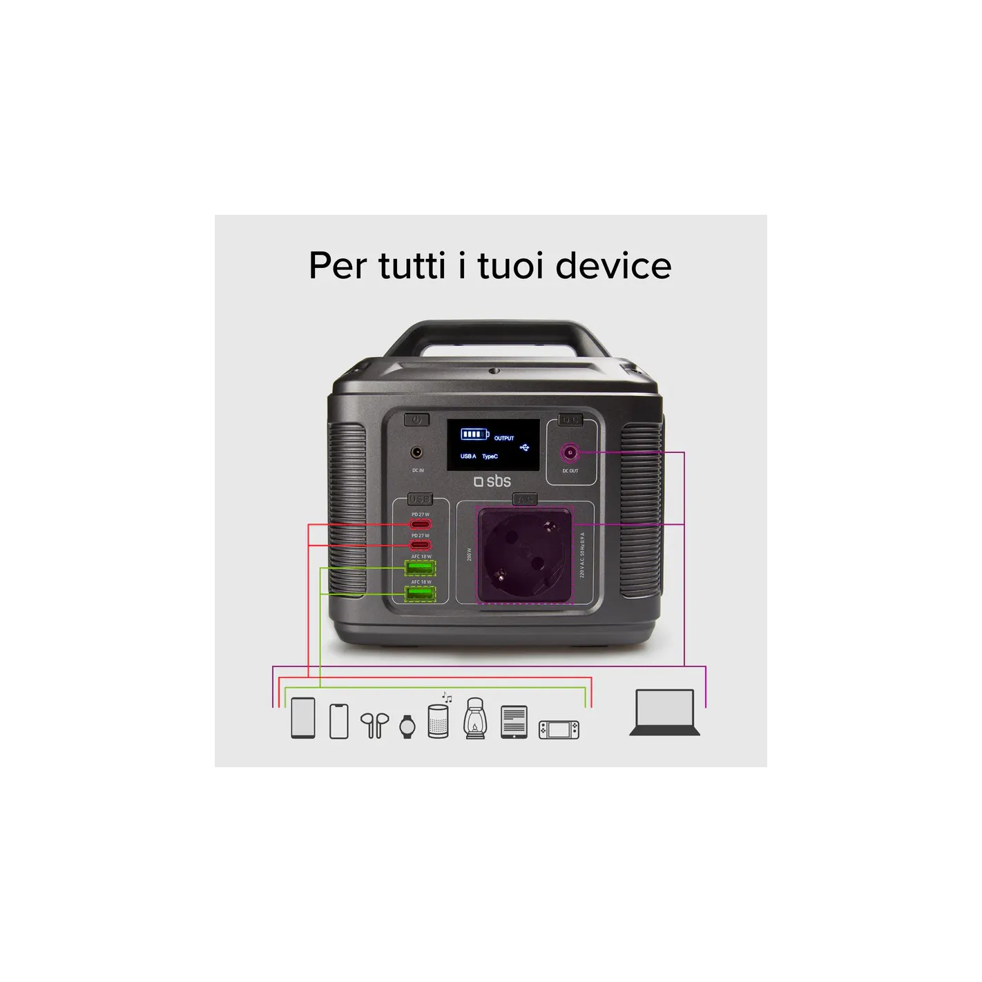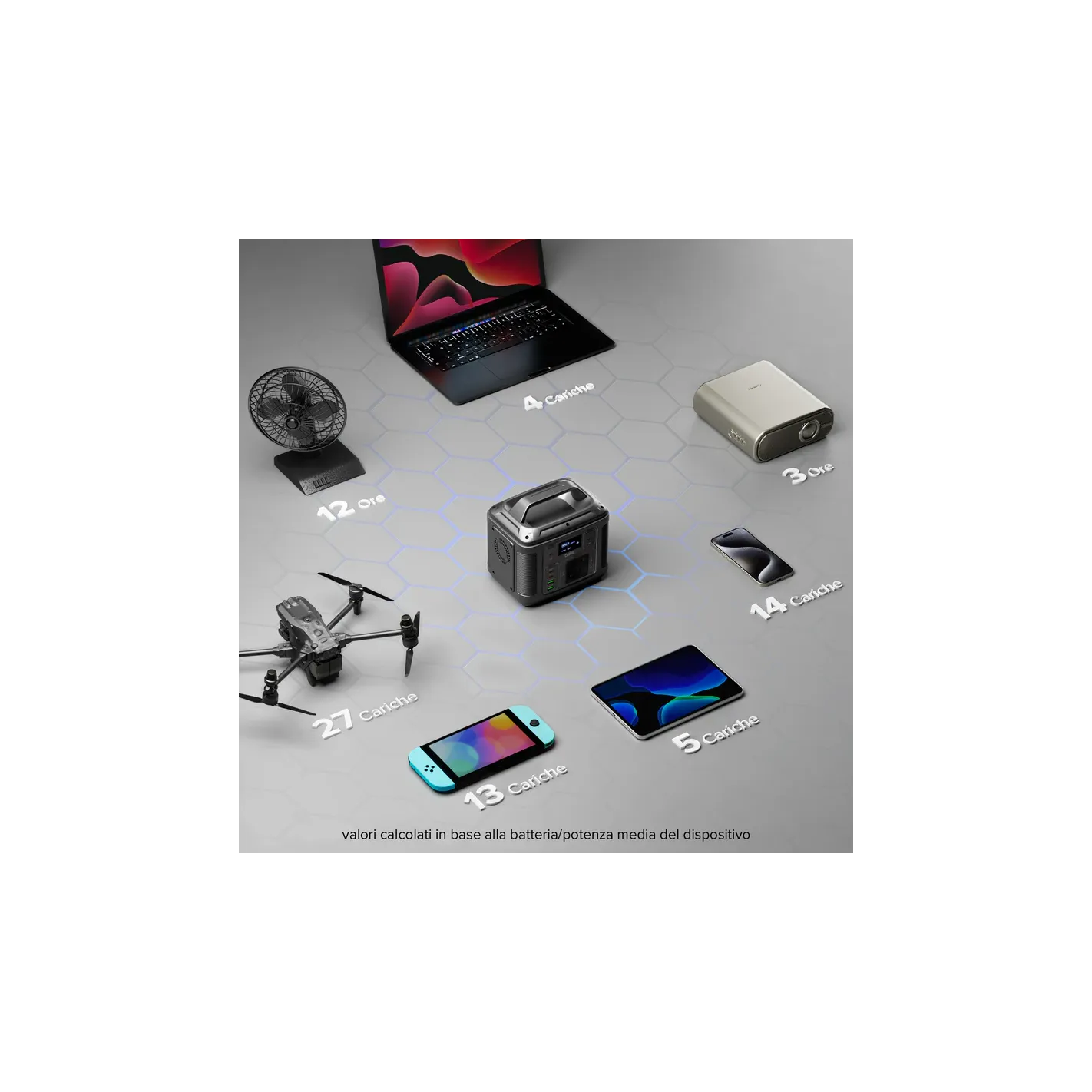 La power station è universale e può ricaricare fino a 6 dispositivi contemporaneamente. E' dotata di 2 porte USB-C con tecnologia Power Delivery (PD) che possono erogare fino a 27 Watt: ideali per ricaricare uno smartphone, un tablet o una console. Le porte USB-A con tecnologia Adaptive Fast Charge (AFC), invece, erogano a 18 Watt e sono perfette per auricolari TWS, smartwatch, speaker, e-reader, lampade da campeggio. Queste tecnologie assicurano una ricarica veloce e assolutamente sicura. La porta DC da 72 Watt è dedicata a dispositivi più esigenti come i laptop compatibili e altri accessori elettronici. La porta più potente è quella AC dedicata a cavi di alimentazione e caricatori con spina Schuko o europea. Questa porta può erogare fino a 200 Watt e può alimentare non solo qualsiasi Notebook, ma anche piccoli elettrodomestici come ad esempio un ventilatore, TV portatilie accessori da camper con potenza compatibile. Controlla la potenza emessa attraverso lo schermo LCD.
